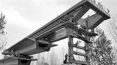 由中国中铁四局和中铁科工联合研制的全国首台JQSS900型过隧运架设备,近日在河南郑(州)徐(州)客运专线跨连霍高速公路特大桥试架成功。该运架设备由JQSS900架桥机和YSS900运梁车组成,能够完成时速200公里至350公里铁路客运专线20米、24米和32米双线箱梁在隧道内、隧道口和门式墩下的运输和架设,具有油耗低、效率高、安全性能好的优点。慎德 同报 郁仁摄