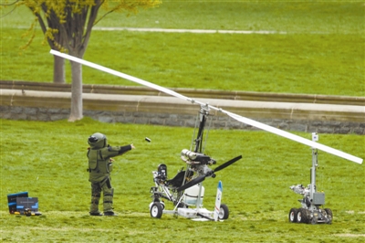 当地时间2015年4月15日,美国华盛顿,一架旋翼直升机降落在美国国会大厦前的草坪上,独自驾驶飞机的一名飞行员被警方逮捕。据报道,飞行员名为道格-休斯,现年61岁,是佛罗里达州的一名邮递员。休斯在本次飞行前通知了一名记者,他还制作了一段名为“一次特别的邮递”的宣传视频,休斯希望通过此举敦促人们关注金融改革和政府部门腐败等问题,他在两年多前就已制订好这项飞行计划。图为防爆小组在直升机前。 东方IC供图