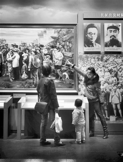 ①4月9日上午,一位自发远道而来为孩子做红色启蒙教育的妈妈指着遵义会议博物馆展厅里的一幅油画对孩子说:“那些戴红星的就是红军……”