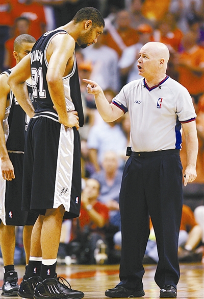 在NBA,裁判的权威不容置疑。图为马刺队邓肯在比赛中与“名哨”乔·克劳福德交流。 CFP供图