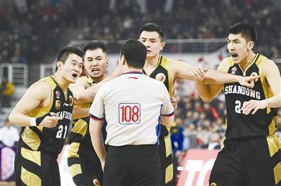 上赛季CBA联赛第34轮,山西对阵山东。在比赛中,许家晗、睢冉、曹振华、陶汉林(从左至右)等山东球员不满判罚围攻裁判。 CFP供图