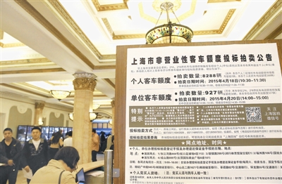 4月17日,市民从上海国际商品拍卖有限公司大厅内的私车额度拍卖公告旁经过。
