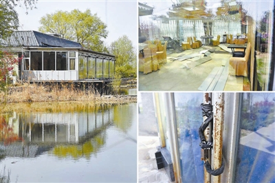 左图:太原市汾河公园内的“在水一方”关停歇业;右上图:“在水一方”餐厅内垃圾满地;右下图:“在水一方”大门紧锁(拼版照片,4月16日摄)。