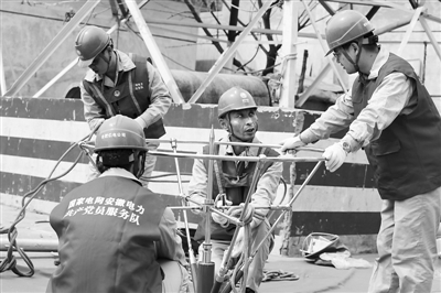 图为2015年4月15日,孙建明带领班组工作人员在雷雨季节到来前为220千伏线路更换绝缘子串、安装避雷器。 (许洁)