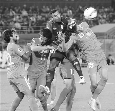 北京国安本轮在主场0比1不敌布里斯班狮吼,最后一轮必须客场死磕韩国水原三星才能力保出线。图为比赛中双方球员拼抢瞬间。 本报记者 许之丰 摄