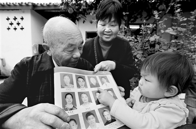 4月21日,四川成都,双流县总工会专程前来慰问老劳模杜兴志。杜兴志拿出县总工会印制的“双流劳模群英谱”画册给曾孙看,曾孙一眼就找到了自己的太爷爷。