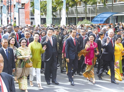 9点左右,纪念活动开始。习近平同来自亚洲、非洲和其他地区的国家领导人从萨沃尔-霍曼饭店沿着亚非大街步行前往万隆会议旧址——独立大厦。习近平夫妇同印度尼西亚总统佐科夫妇等走在队伍前列,一边走一边向道路两旁的人群挥手致意。60年前万隆会议召开时,与会的亚非国家领导人就是从萨沃尔-霍曼饭店步行到独立大厦参加会议的。