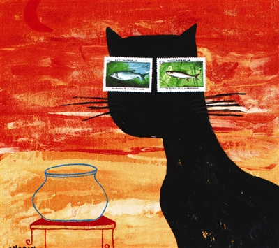 猫儿脑袋里想着鱼,眼睛看到的也是鱼,可惜主人已将缸中宠物挪走,月光中的小猫一声叹息,画家还巧用了邮票上的鱼。【意大利】赛尔奇奥