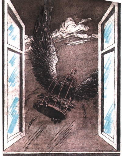 被擒雄鹰锁在樊笼内,它岂能忍受囹圄之苦?为争脱羁绊奋力抗争。经过百般磨难终于夺窗而出——期待它展翅冲向云天。【俄罗斯】斯克里耶夫