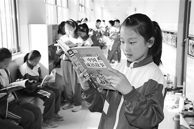 4月22日,山东省淄博市临淄区晏婴小学学生正在“走廊书吧”看书。在世界读书日到来之际,该校把图书馆中的40000余册书籍搬到了走廊、楼梯口,建成了自助式的“走廊书吧”,学生可以根据兴趣自由阅读。
