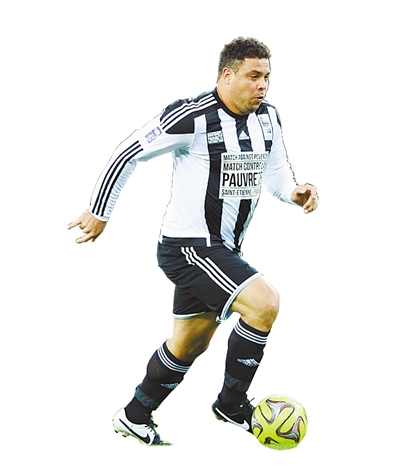 当地时间4月20日,2015年度联合国发展计划署“对抗贫穷”足球慈善赛在法国圣埃蒂安举行,罗纳尔多、齐达内、西多夫、特雷泽盖领衔众球星亮相。在本场比赛中,尽管齐达内、罗纳尔多联队以7比9不敌世界明星队,但罗纳尔多还是宝刀不老,上演帽子戏法。图为罗纳尔多标志性的带球瞬间,发福的体型让不少球迷感叹:时间是把杀猪刀啊。