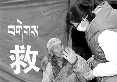 4月26日,在聂拉木县城,一名医护人员救治伤员。尼泊尔发生8.1级地震后,西藏日喀则吉隆县和聂拉木县部分群众受到影响,目前,救援工作正紧张有序进行。 新华社记者 觉果 摄