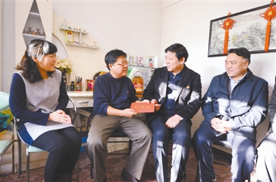 天津市委常委、政法委书记、总工会主席袁桐利到困难职工张伟家中慰问 (张磊 摄)