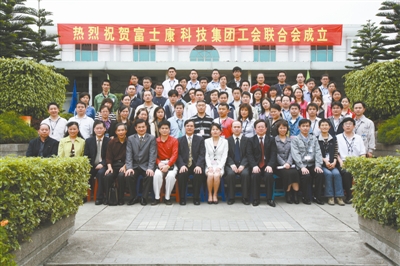 富士康科技集团工会联合会于2007年3月25日在深圳龙华园区成立。截至目前,富士康工会已先后在郑州、成都、重庆、昆山、南宁、武汉、北京、太原、晋城、烟台、廊坊、天津、贵阳等18个城市建立了 27个园区工会组织,实现集团工会、园区/事业群工会、事业处分会、工会小组四级组织网络全覆盖,32897名专兼职工会干部,服务100余万名富士康员工。
