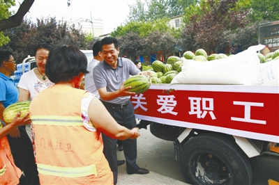 三门峡市总工会党组书记、常务副主席武跃峰为环卫工人送清凉