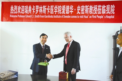 2014年11月7日,瑞典诺贝尔医学生物奖常务评委爱德华·史密斯和孙晓阳亲切握手