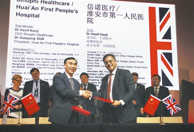 2013年12月2日,北京君悦酒店,孙晓阳在中英工商峰会上与英国信诺医疗投资有限公司首席执行官汉夫亲切握手
