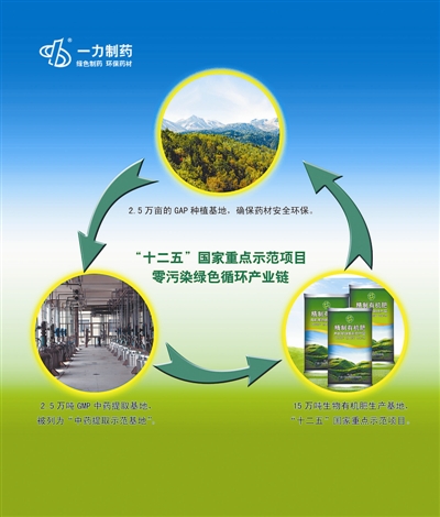 在产业链的第三个环节,也是最为重要的一节。中药提取废弃物环保处理循环经济项目,将中药渣制成生物有机肥,完成了中药渣从“废物”到“宝物”的华丽变身。由于一力制药每年要处理超过15万吨的中药渣,如何处理中药渣的污染成了一道难题,在考察了世界药渣处理最先进的几个国家和地区后,一力制药与台湾合作,投资1.5个亿打造全国第一个中药渣制备生物有机肥/饲料基地,该项目已被国家发改委纳入国家“十二五”规划重点示范项目,获得国家财政拨款及广东省低碳发展专项资金支持。