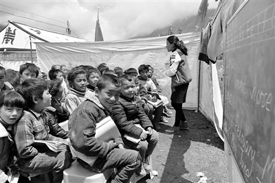 4月29日,来自拉萨尼木县的英语老师罗布卓嘎在临时帐篷内教学。吉隆县萨勒完小位于西藏边境村之一的萨勒村中,受尼泊尔地震影响,学生在地震发生后被迫停课。