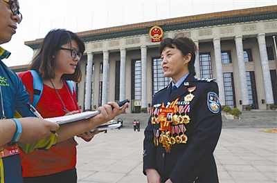 表彰大会结束后,记者采访受表彰者。