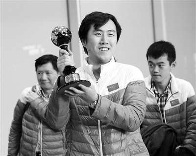 4月28日,在第10届国际象棋男子世界团体锦标赛上,中国队以9战6胜3平积15分的成绩,首夺冠军。这是继去年首次夺得奥赛男团冠军后,中国男子国象队书写的又一历史篇章。图为中国男子国象队主力队员卜祥志4月30日在首都国际机场向记者展示冠军奖杯。本报记者 袁浩 摄