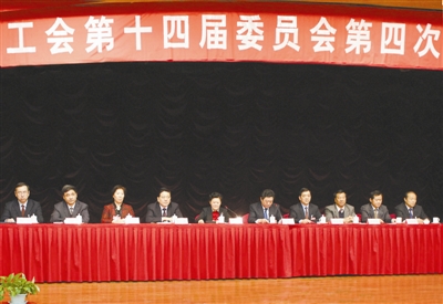山东省总工会第十四届委员会领导集体,从左至右依次为李臻、蒋石宝、魏丽、赵立群、尹惠敏、刘赞杰、冯庆禄、王星海、贺余德、侯国华。