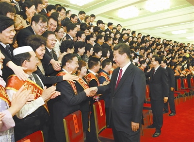 上午9时30分,习近平等来到人民大会堂北大厅,同代表们亲切握手,并合影留念。