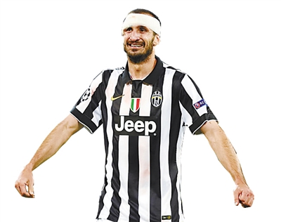 当地时间5月5日,在2014/2015欧冠半决赛首回合争夺中,主场作战的尤文图斯以2比1力克卫冕冠军皇家马德里,占得先机。图为尤文图斯后卫基耶利尼在争抢中血染赛场,经过队医包扎后,头缠绷带,继续奋战。