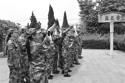 5月5日,队员们在山东台儿庄老火车站遗址,拍照留念,缅怀抗日英雄。