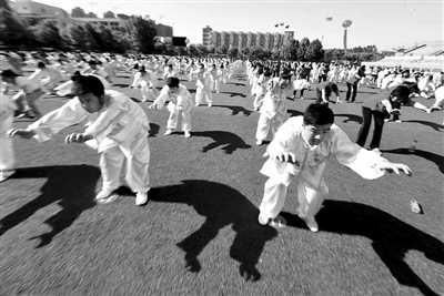 5月12日,安徽亳州千名职工在亳州职业技术学院展演华佗五禽戏。当日,该市举行全市职工五禽戏展演比赛,来自全市的22支职工代表队的1000多名五禽戏习练者参加了展演活动。
