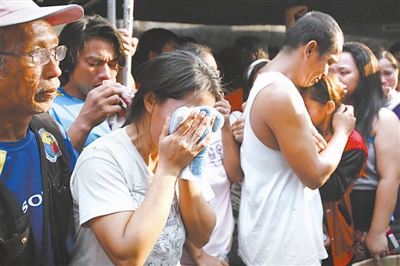5月13日,在菲律宾首都大马尼拉地区巴伦苏埃拉市,火灾失踪者的亲属掩面哭泣。马尼拉消防局13日说,巴伦苏埃拉市一橡胶拖鞋厂当天发生火灾,死亡人数已升至31人。 新华社发 (乌马利 摄)