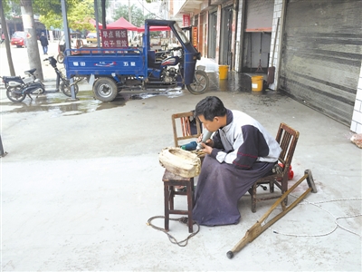 在商城县,记者找到了一家根艺奇石馆,店主叫林志祥,高位截肢。