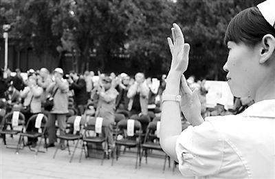 近日,北京市医院管理局在北京地坛公园召开“2015年北京护理文化周”开幕式,并举办“护行健康、服务百姓”现场公益行动,来自北京市属22家医院最优势学科的医生、护士走到百姓身边,延伸护理服务。图为护士带领百姓共同学习预防帕金森手指操、中医八段锦等自我保健技巧,提升百姓居家护理技能。蒙萱 摄