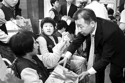近日,中国残疾人福利基金会与北京东方明康医用设备股份有限公司共同开展了“点亮脑瘫儿童希望之光——集善明康脑瘫儿童救助”项目。北京东方明康医用设备股份有限公司向中国残疾人福利基金会捐赠了1000台用于脑瘫儿童康复治疗的MK-A型肌兴奋治疗仪。图为该公司董事长张进慰问脑瘫儿童。陈亚伟 摄
