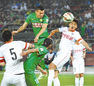 5月16日晚,2015年中超联赛第10轮,北京国安主场2比0战胜辽宁宏运。图为辽宁队门前的混战。本报记者 许之丰 摄