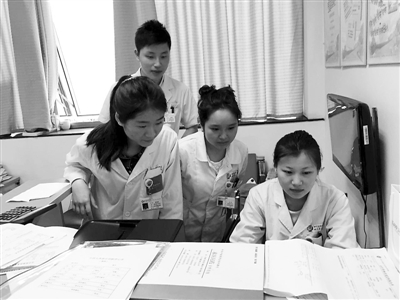 获悉新的供体资源后,薛瑾四人一同在电脑上寻找合适受体。 左一陈婉崇,左二邓智轩,中间何小平,右一薛瑾。 本报记者 李娜 摄