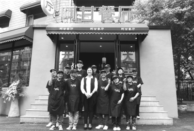 5月19日,在阿甘餐厅门口,“阿甘妈妈”胡艳苹(前中)与在餐厅工作的智障人士合影。当日,以促进智障人士平等参与社会工作为目的的吉林省首家支持性就业基地——阿甘餐厅,在吉林省长春市揭牌营业。12位通过岗前专业培训、身着整洁工装的智障人士正式走上就业岗位。新华社记者 林宏 摄