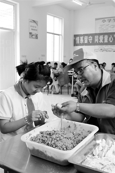 5月17日,国网枣庄供电公司台儿庄客户服务分中心党员服务队来到当地薛庄中心小学,为孩子们送去书包、篮球和足球等学习和文体用品,并了解他们的家庭情况和学习成绩,鼓励他们努力学习,快乐成长。图为党员服务队员和孩子们一起包饺子。