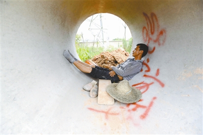 5月11日,广西南宁,一位农民工中午在路边一个用来做下水道的水泥管道里睡午觉。