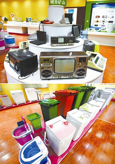 这张5月13日拍摄的拼版照片显示的是:在山西省天元循环经济园区展览室内展出的废旧家电(上图);在山西省天元循环经济园区展览室内展出的用废旧家电为原料再制造的电器和日用品(下图)。中国国家发改委发布的数据显示,我国家用电器已经进入报废高峰期,每年理论报废家电量超过5000万台,预计到“十二五”末期,年报废量将达到1.6亿多台。在绿色环保、节约能源的大环境下,改变现存的废旧家电回收处理方式、建设正规有序的废旧家电回收市场势在必行。 新华社记者 燕雁 摄