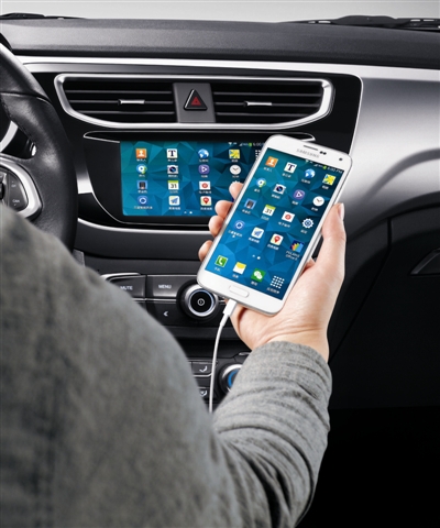 中华V3最大的亮点当属这块7英寸多媒体屏的功能,通过数据线可将安卓系统手机与该系统匹配。品牌涵盖了三星、华为、小米、HTC、索尼、中兴、魅族、OPPO、LG、联想中的大部分安卓4.0以上系统机型。现场与小米手机匹配,我们可以很轻松地将手机中的导航等App匹配在这块7英寸车载屏幕上,并可以在车载大屏和手机上双向操作。