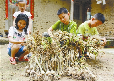 眼下夏收时节,不少留守娃和大人一样忙碌:他们有的当起了放牛娃,有的帮忙收获油菜籽,有的为家人洗衣、做饭,也有的帮忙插秧。图为湖北安陆市西部王义贞镇中心小学几名四五年级孩子在帮大人收获大蒜。王代金 胡深丽 摄