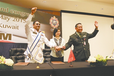 北京时间5月21日,在科威特首都科威特城召开的国际军事体育理事会第70届代表大会第四次全体会上,国际军体主席哈基姆·艾尔希诺(左)正式宣布,中国武汉获得2019年第七届世界军人运动会承办权。 新华社记者 李志平 摄