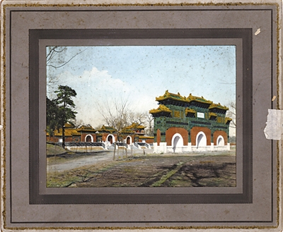 ②20世纪初,北海西天梵境前琉璃牌坊。此帧为时代较早的着色照片之一,十分精美。