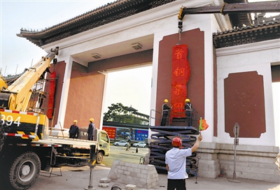 当日,北京首钢厂东门迁建项目正式启动,施工单位开始搭建脚手架,进行拆除工作。为配合北京市重点建设项目长安街西延道路工程建设,首钢总公司决定对位于工程规划红线范围内的首钢厂东门按照原貌原建原则异地迁建。 本报记者 许之丰 摄