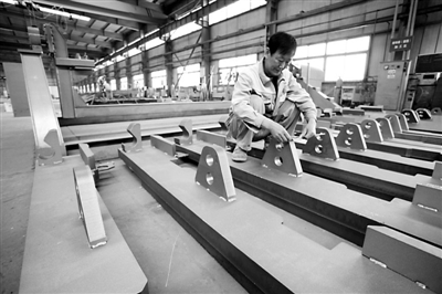 5月25日,河北张家口,宣化万丰机械厂王春洪在测量大件变位机部件。今年67岁的王春洪是宣化万丰机械厂的一名老焊工,现为工厂技术顾问。