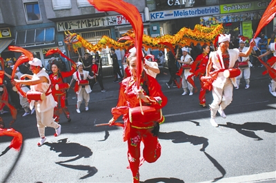 5月24日,在德国柏林,来自中国的安塞腰鼓表演队在柏林文化狂欢节上参加游行。