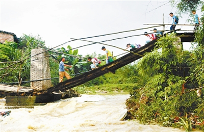 5月25日,广西梧州市龙圩区广平镇沙头桥上,一些学生在家长的护送下,小心翼翼地在单薄的木板便桥上通行。
