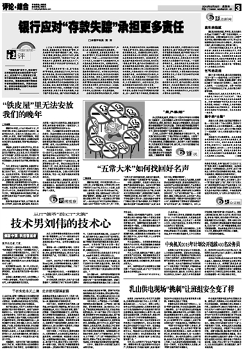 众所周知 ,作为“五常市”名称来源的传统文化中的“五常”(即“仁义礼智信”),其中一“常”便是“诚信”之“信”,而时下的“五常大米”,却因其假冒而呈现出产品信用意义上的失常。相关部门在加大监督打击力度的同时,有关企业也应积极主动维权,尽快改变这种诚信失常的局面,为“五常大米”找回好名声。