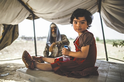5月26日,一名来自安巴尔省的小难民在伊拉克首都巴格达和安巴尔省的边界地带休息。新华社记者 陈序 摄